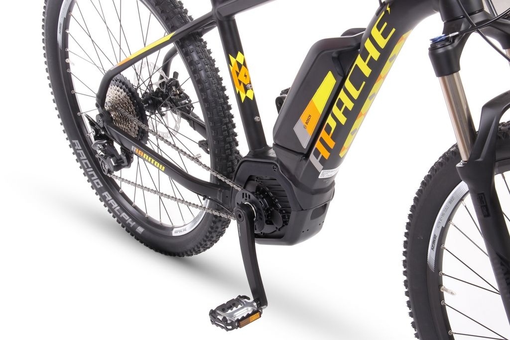 Seznam použitých komponentů jasně napovídá, že před sebou máme jeden z nejlépe osazených modelů značky Apache. Rám je v tomto případě usazen na 27,5“ zapletených kolech s ráfky Remerx Sting, náboji Shimano Deore a plášti Schwalbe Racing Ralph. O odpružení se stará lehká vzduchová vidlice Rock Shox Judy Boost Solo Air se zdvihem 100 mm, pevnou přední osou a možností uzamčení z řídítek. Pohonnou soustavu tvoří sada Shimano SLX s 11 rychlostmi doplněná o přehazovačku Shimano XT a kliky Miranda Delta. Z nabídky značky Shimano pocházejí rovněž hydraulické kotoučové brzdy řady Deore.