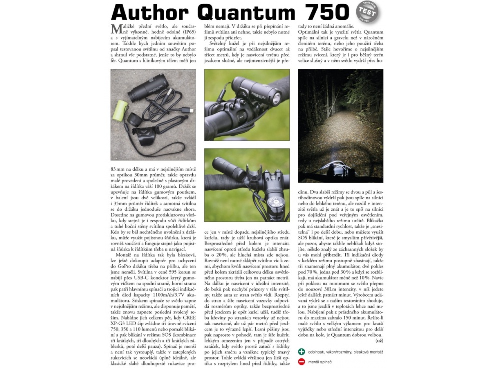 AUTHOR QUANTUM 750 L-Run je USB dobíjecí světlo s velkou parabolou a CREE XP-G3 LED čipem 750 lumenů. Toto světlo nabízí 5 režimů, které se přizpůsobí jízdě ve městě nebo v terénu. Parabola se sklem je upevněna v pouzdře z duralu a je vyrobena tak, aby maximalizovala světelný výkon a optimalizovala tvar osvětlené plochy. Velmi praktický je LED indikátor kapacity baterie, který přesně informuje o stavu baterie, snadno tedy přizpůsobíte režim svícení kapacitě baterie tak, abyste byli osvětleni.