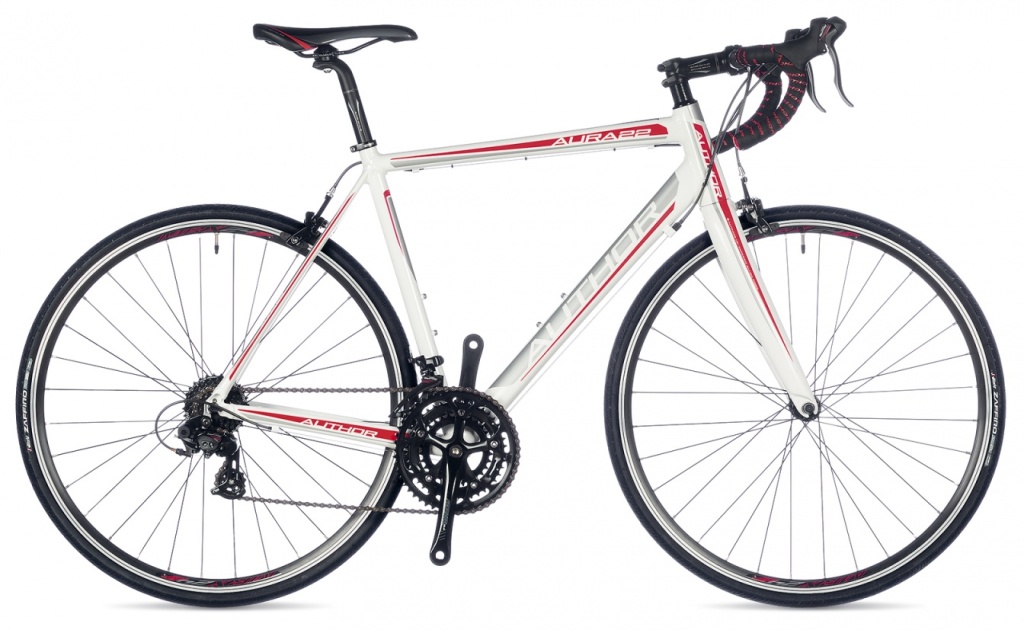 Silniční kolo Author Aura 22 na duralovém rámu s trojitě zeslabovanými trubkami, s duralovou vidlicí a komponenty Shimano.