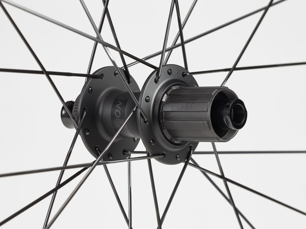 • Náboje pro kotoučovou brzdu s uchycením Center Lock, 12mm pevná přední a zadní osa, silniční náboj Bontrager Rapid Drive 108.