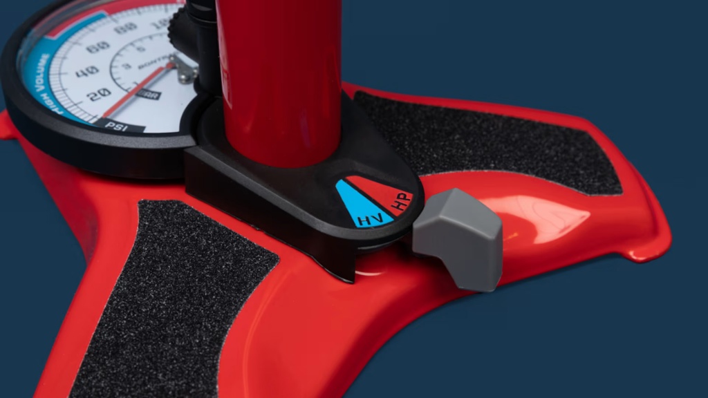 Univerzální nožní pumpa, která umožňuje volbu nastavení na velkoobjemové pláště či pláště s vyšším tlakem.