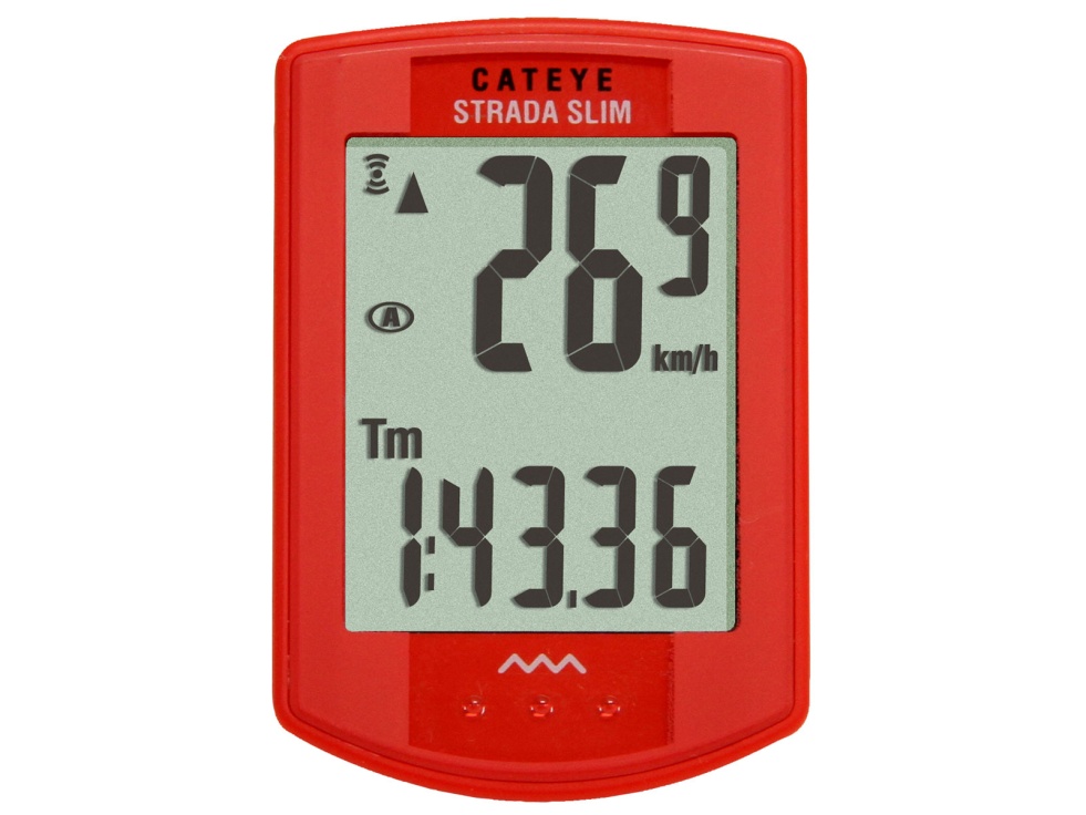 Tenký bezdrátový/beztlačítkový cyklopočítač CATEYE malých rozměrů s velkým displejem a číslicemi. Standardní snímač rychlosti SPD-01. 8 funkcí: denní (1 a 2) / celková vzdálenost, okamžitá / průměrná / max. rychlost, čas jízdy, hodiny, funkce Pacer – indikátor (šipky) poměřující okamžitou a průměrnou rychlost, nastavitelné dva průměry kola a celková vzdálenost, aut. funkce START / STOP, bezdrátový přenos na vzdálenost až 60cm, otočný držák „Flex-Tight“ s univerzální objímkou umožňující připevnění na všechny průměry řídítek nebo představců, k montáži držáku a snímače není potřeba žádné nářadí.