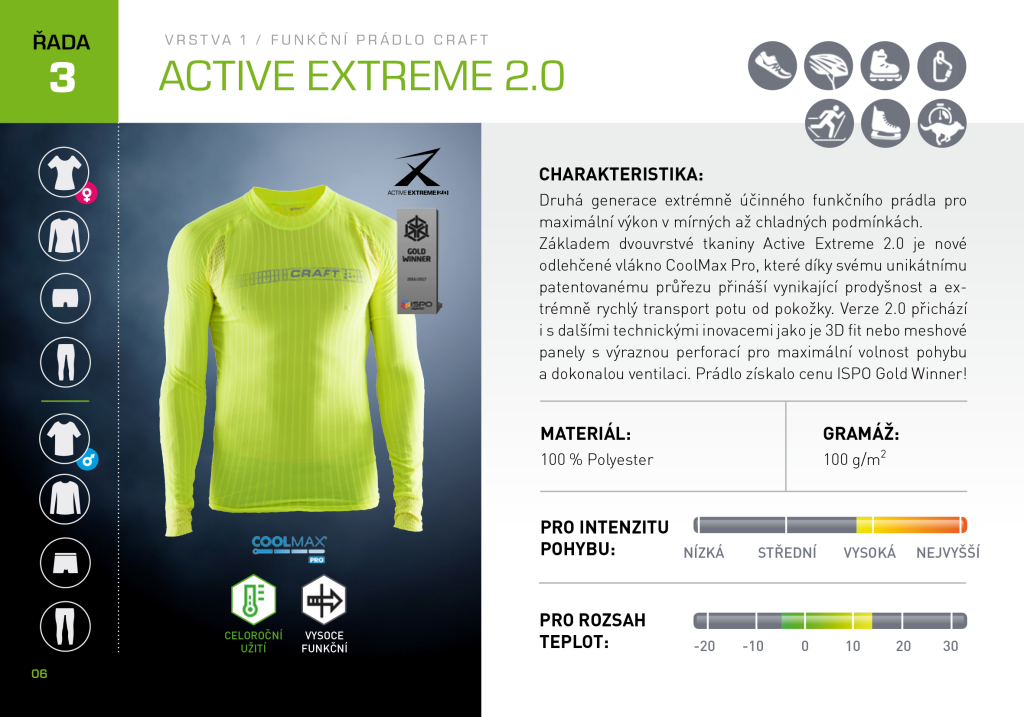 CRAFT patří mezi světovou špičku ve vývoji funkčního prádla – tedy první vrstvy, která je v přímém kontaktu s pokožkou. Jejím úkolem je odvádět vlhkost od těla a pomáhat udržet správnou teplotu při různých intenzitách pohybu a v různých klimatických podmínkách.