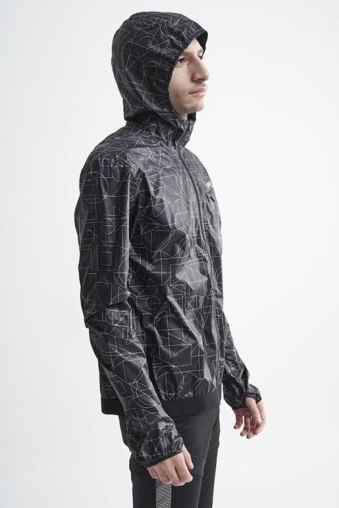 Pánská lehká bunda s kapucí CRAFT Lumen Wind s celoreflexním potiskem vhodná na běh a jiné aktivity v proměnlivém větrném počasí. Módním prvkem je retro střih typický ukončením spodní části bundy do široké gumy.