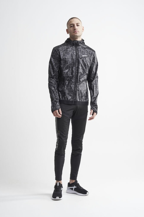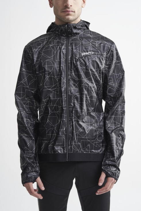 Pánská lehká bunda s kapucí CRAFT Lumen Wind s celoreflexním potiskem vhodná na běh a jiné aktivity v proměnlivém větrném počasí. Módním prvkem je retro střih typický ukončením spodní části bundy do široké gumy.