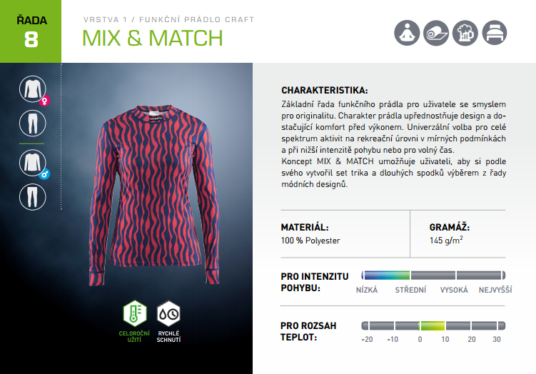 Funkční prádlo CRAFT se za více než 30 let své existence stalo mezi sportovci symbolem těch nejvyšších standardů v první vrstvě oblékání. Úkolem první vrstvy je odvádět pot od pokožky a udržovat u těla optimální množství tepla – v zimě hřát a v létě chladit. Proto CRAFT vyvinul 3 základní řady funkčního prádla první vrstvy s odlišnými vlastnostmi pro všechny druhy klimatických podmínek – COOL, Be ACTIVE a WARM. Výběr nejvhodnějšího prádla pak závisí vždy na vzájemném poměru venkovní teploty (a klimatických podmínek vůbec) a předpokládané intenzitě pohybu.