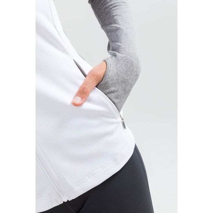 Dámská technická běžecká bunda s membránou následující nejnovější trendy v používání pletenin s bezešvými přechody. Ideální pro podzimní nebo jarní běhání.