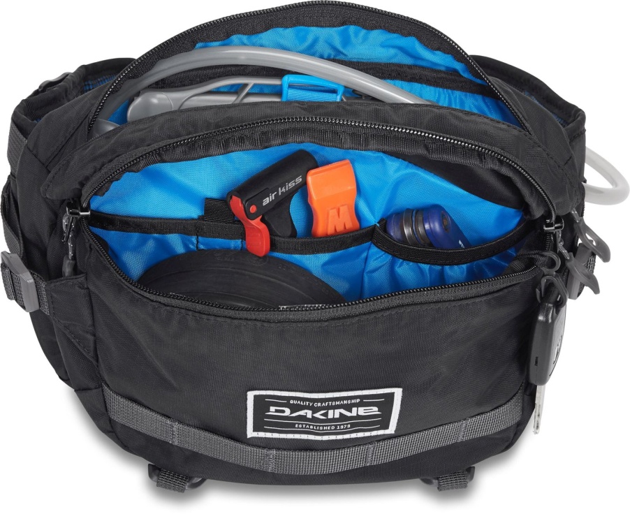 Cyklistická ledvinka Dakine Hot Laps 5l je ideálním řešením pro bikery, kterým nevyhovuje batoh, ale chtějí si sebou na vyjížďku sbalit vše potřebné. Do jejích cargo kapes se pohodlně vejde svačina, nářadí, telefon a lehká bunda. Díky 2l pitnému vaku, který je ergonomicky uzpůsoben spodní části zad, vás venku nezaskočí ani žízeň. O teplotní komfort a suchá záda se postará Air Flow zadní panel.