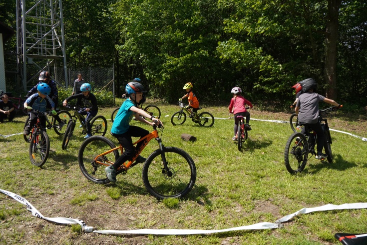 Kolem poledne jsme pro děcka připravili různé hry & soutěže na kole. Děti hráli tzv. vytlačovanou (blokovačku), kdy všichni najeli do vyznačeného území a nesměli dát nohu z pedálu nebo z něj vyjet. To se dětem opravdu líbilo a čím méně jich vždy v kruhu bylo, tím jsme ohraničení zmenšovali. Pak ve vyznačeném kruhu hráli na babu, měnili směr jízdy atd.. Závěrečnou soutěží byly štafety ve dvou týmech, kdy děti museli zvládnout objet 2/3 trailu vždy ve dvojici, která nastoupila proti sobě.