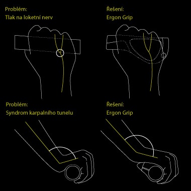 Gripy Ergon GC1 jsou uzpůsobeny pro jízdu na kole, které má řidítka zahnutá zpět, např. klasická městská kola. Toto prohnutí řidítek zatěžuje nezvyklým způsobem zápěstí. Gripy GC1 tuto zátěž eliminují na minimum. Grip je vyroben z německých gumárenských směsí, které jsou UV stabilní a netoxické. Speciálně umístěna textura společně s různou tvrdosti gumy Vám zajísti vysoký komfort a bezpečnost úchopu.