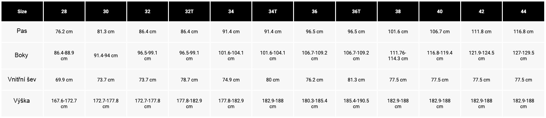 | Nohavice | 76 – 77 | 76 – 77 | 78 – 79 | 79 – 80 | 80 – 81 | 81 – 83 | 81 – 83 |
