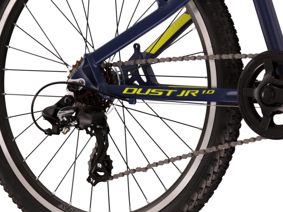 Doplňky Krossa Dust 1.0 umožňují mladému cyklistovi zdokonalit techniku jízdy příjemným a bezstresovým způsobem. 8 převodů ovládaných přesmykačem Shimano Tourney stačí pro plynulé stoupání a rychlé cestování po rovinatých úsecích a jednoduché a výkonné brzdy V-Brake zajišťují bezpečné brzdění kola. Přední tlumič se zdvihem 50 milimetrů zvyšuje komfort jízdy v terénu.