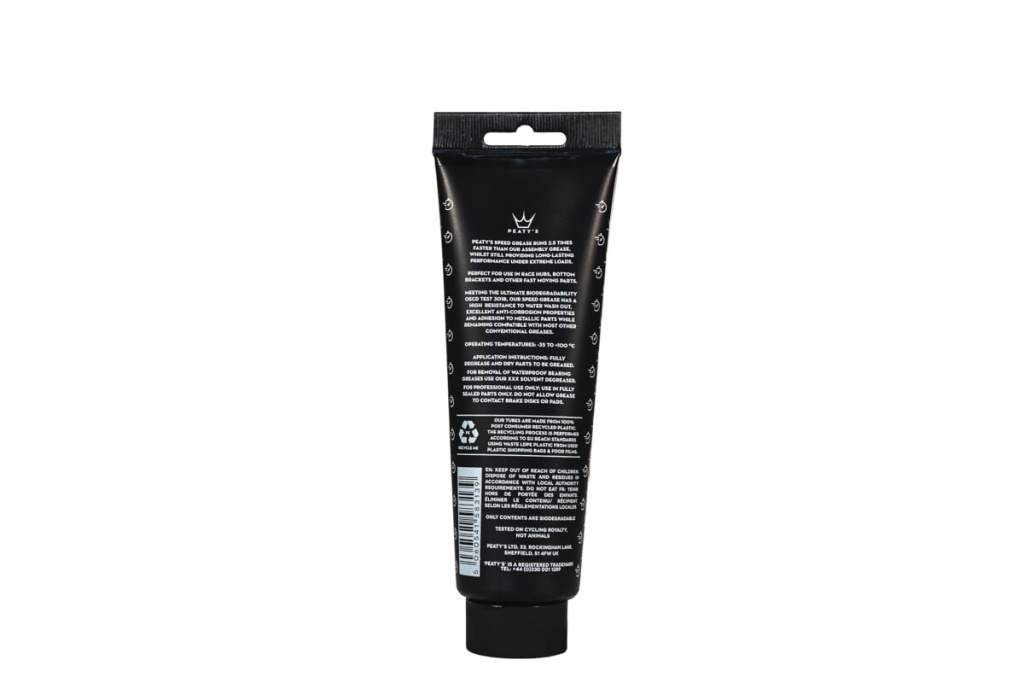 Montážní vazelína Speed Grease vykazuje 2,5krát nižší tření než Assembly Grease, přitom si ale stále zachovává dlouhodobý výkon i při extrémních tlacích. Je dokonalou volbou pro náboje, středová složení, pedály a jiné rychle se pohybující části. Peaty’s Speed Grease splňuje vysoce náročný test 301B biologické rozložitelnosti, zároveň však vykazuje vysokou voděodolnost, vynikající antikorozní vlastnosti a přilnavost ke kovovým částem a je plně slučitelný s většinou ostatních konvenčních maziv.