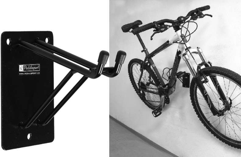 Držák na kolo za pedál je určen k zavěšení jízdních kol všech typů (včetně celoodpružených) na zeď za pedál. Umožňuje prostorově velice úsporné uložení kola. Oproti konkurenčním držákům za pedál zamezuje naše konstrukce přetočení nevyváženého kola (t.j. např. kolo s odpruženou vidlicí). Nosnost 21 kg. Vyrobeno v ČR.
