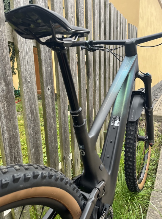 Zadní tlumič : FOX NUDE 5T EVOL Trunnion, SCOTT custom w. travel / geo adj., 3 modes: Lockout-Traction Control-Descend, custom large Air volume / DPS / Reb. Adj., Travel 150–100-Lockout / T185X55mm
