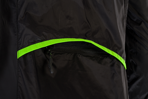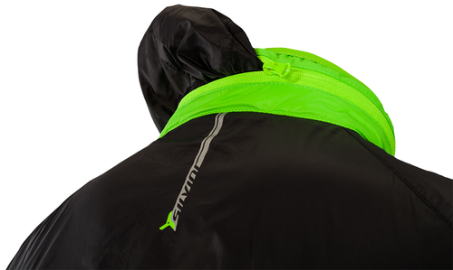 Díky tomu má výborné větru vzorné vlastnosti, a když máte bundu na sobě, tak o ní téměř nevíte. Bunda má dlouhý hlavní zip, který je na konci pod bradou překrytý ochranou légou. Bundu můžete velmi snadno během několika vteřin sbalit do zadní kapsy. Sbalená bunda se vám vejde i do zadní kapsy na dresu a můžete ji tak mít u sebe při každé vyjížďce. Když už je počasí opravdu nepříjemné může vám posloužit kapuce, která je schovaná v límci. Stačí rozepnout zip a vyndat ji. Díky gumě v lemu kapuce vám perfektně přilne k hlavě. Límec je z vnitřní strany z počesaného materiálu.