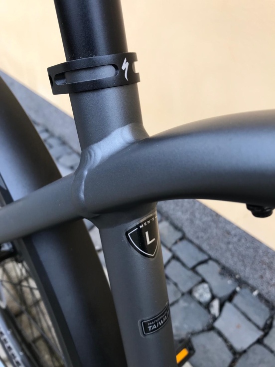 Turbo Vado aluminum frame with bottom bracket motor mount, fitness/transpor­tation geometry, fully integrated lockable down tube battery, internal cable routing, fender/rack mounts, smooth welds, reflective graphics