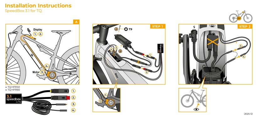SpeedBox 3.1 je čip třetí generace pro tuning elektrokol vybavených motorem TQ HPR40/50/60. Umožňuje libovolné nastavení rychlostního limitu. Po instalaci se na displeji zobrazují reálné údaje – maximální a průměrná rychlost, denní nájezd a odhadovaný dojezd.