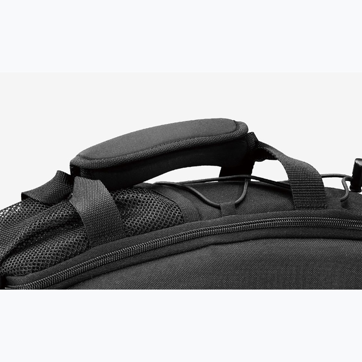Dvojitě tvarované boční panely v kombinaci s pružnou tkaninou o hustotě 600 denierů tvoří polotuhou, odolnou brašnu na nosič, která odolá nepříznivému počasí. Nabízí rozdělenou hlavní přihrádku, boční přihrádky ze síťoviny a zadní držák na láhev. Připevňuje se pomocí integrovaných popruhů.