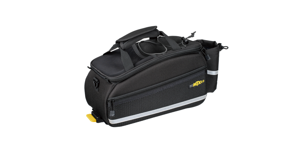 Odolná brašna TrunkBag kompatibilní s technologií MTX QuickTrack®. Kromě hlavní komory obsahuje dvě boční přihrádky ze síťoviny pro větší kapacitu a zadní držák na láhev.