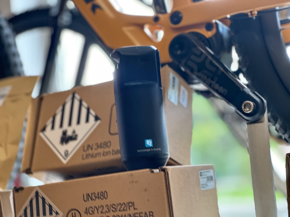 Skvěle pasuje do postranního košíku na lahve na vnitřním trojúhelníku, kde je krátká vzdálenost k nabíjecímu portu. Na místě ho zajišťuje popruh (kabel přídavné baterie a retenční popruh se prodávají zvlášť.)