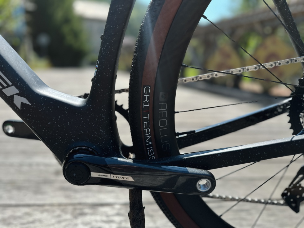 Lehký a aerodynamický rám z karbonu OCLV řady 800 s technologií IsoSpeed zaměřenou na pohodlí a se spoustou úchytů na přepravu potřebných věcí na závody. Karbonová kola Bontrager Aeolus Pro 3V a kombinace řídítek a představce Trek Aero RSL z karbonu zaručují lehkou a hbitou jízdu. Dále pohon SRAM XPLR AXS D2 s bezdrátovým řazením, který je určen pro drsnější silnice.