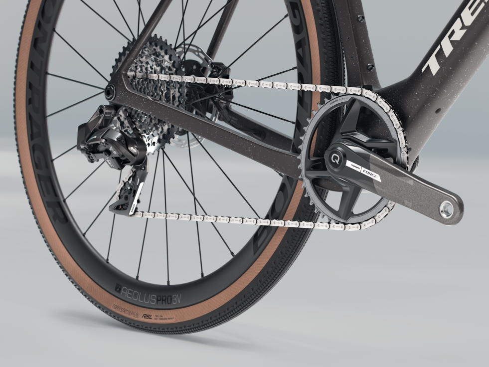 Lehký a aerodynamický rám z karbonu OCLV řady 800 s technologií IsoSpeed zaměřenou na pohodlí a se spoustou úchytů na přepravu potřebných věcí na závody. Karbonová kola Bontrager Aeolus Pro 3V a kombinace řídítek a představce Trek Aero RSL z karbonu zaručují lehkou a hbitou jízdu. Dále pohon SRAM XPLR AXS D2 s bezdrátovým řazením, který je určen pro drsnější silnice.
