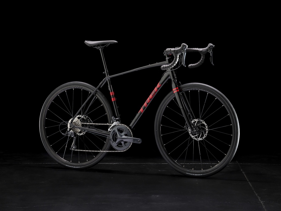 Lehký hliníkový rám Alpha řady 200 s obrovským prostorem pro pláště, karbonová kotoučová vidlice, 12mm pevné osy, pohon 2x9 Shimano Sora, úchyty na blatníky a nosiče, mechanické kotoučové brzdy Tektro pro brzdný účinek v každém počasí, kola umožňující použití bezdušových plášťů a pláště Bontrager R1 Hard-Case Lite 700x32.