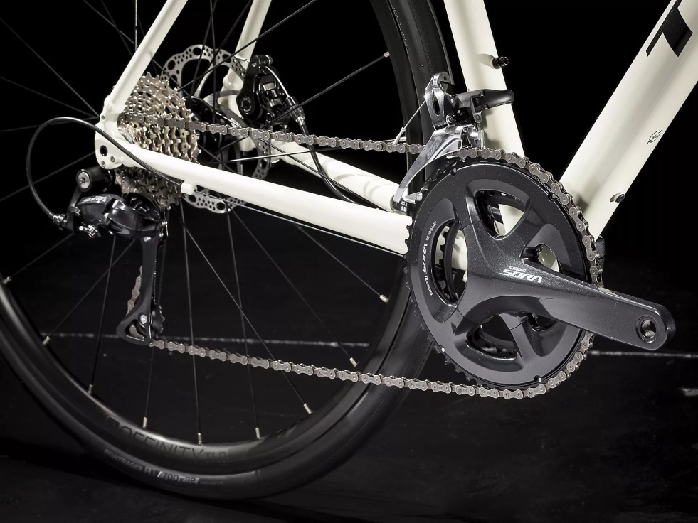Lehký hliníkový rám Alpha řady 200 s obrovským prostorem pro pláště, karbonová kotoučová vidlice, 12mm pevné osy, pohon 2x9 Shimano Sora, úchyty na blatníky a nosiče, mechanické kotoučové brzdy Tektro pro brzdný účinek v každém počasí, kola umožňující použití bezdušových plášťů a pláště Bontrager R1 Hard-Case Lite 700x32.