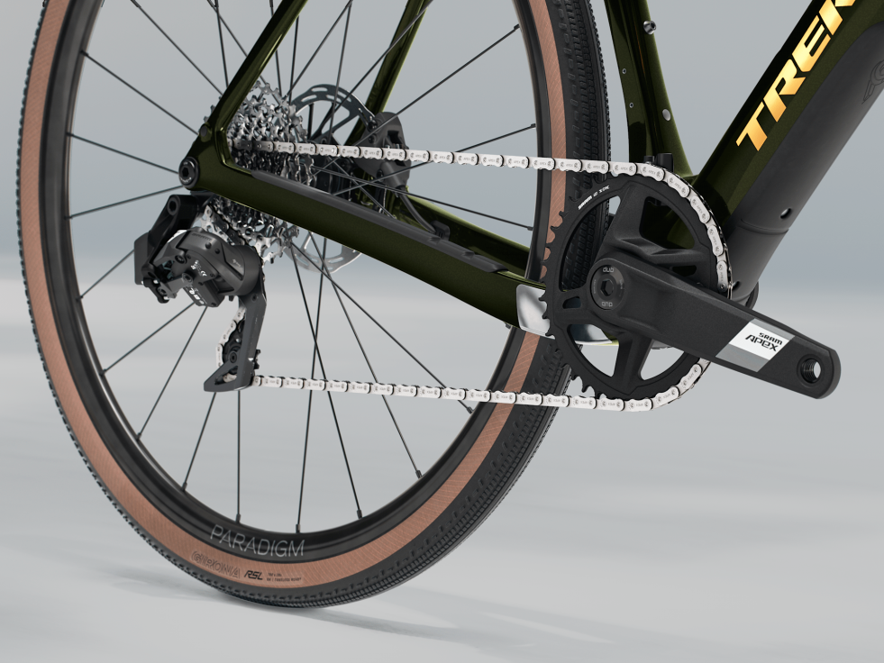 Rám z karbonu OCLV řady 500 s karbonovou vidlicí, vnitřním úložným prostorem ve spodní rámové trubce, úchyty na rámu i vidlici a prostorem pro 50mm pláště (naměřeno). 12rychlostní zcela bezdrátový pohon 1x SRAM Apex XPLR AXS, hydraulické kotoučové brzdy, karbonová sedlovka a kola Bontrager Paradigm SL se 42mm plášti připravená na bezdušovou verzi.