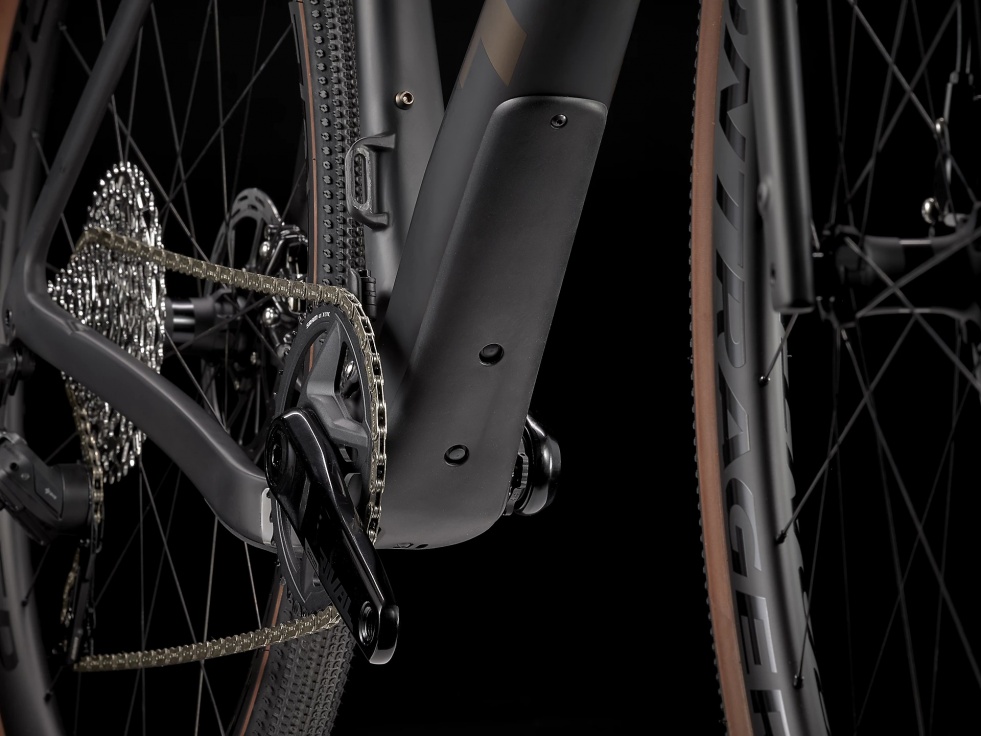 Rám z karbonu OCLV řady 700 s předním prvkem IsoSpeed a karbonovou ochranou, progresivní geometrie, která je stabilní při vysokých rychlostech a účinná při náročném stoupání, vnitřní úložný prostor, skrytá lanka, která nepřekážejí brašnám, úchyty na brašny integrované v rámu a úchyty na blatníky. Dále karbonová vidlice, bezdrátový elektronický pohon 2x12 SRAM Rival eTap AXS s kazetou se širokým rozsahem, karbonová kola Bontrager Aeolus Pro 3V OCLV se širokými gravelovými plášti 700x40c pro lepší trakci a stabilitu. Pojme až 45c pláště.