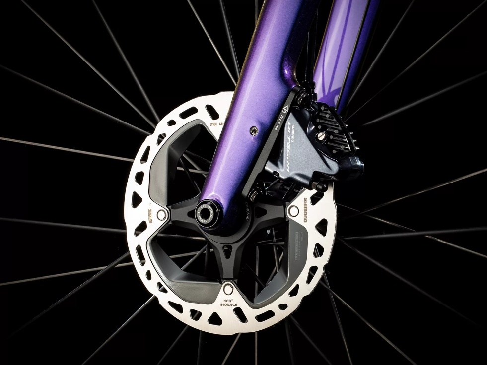 Vidlice Domane SL karbon, kónický karbonový sloupek, vnitřní vedení brzdových lanek, úchyty na blatníky, kotouč s úchytem Flat Mount, pevná osa 12 × 100 mm.