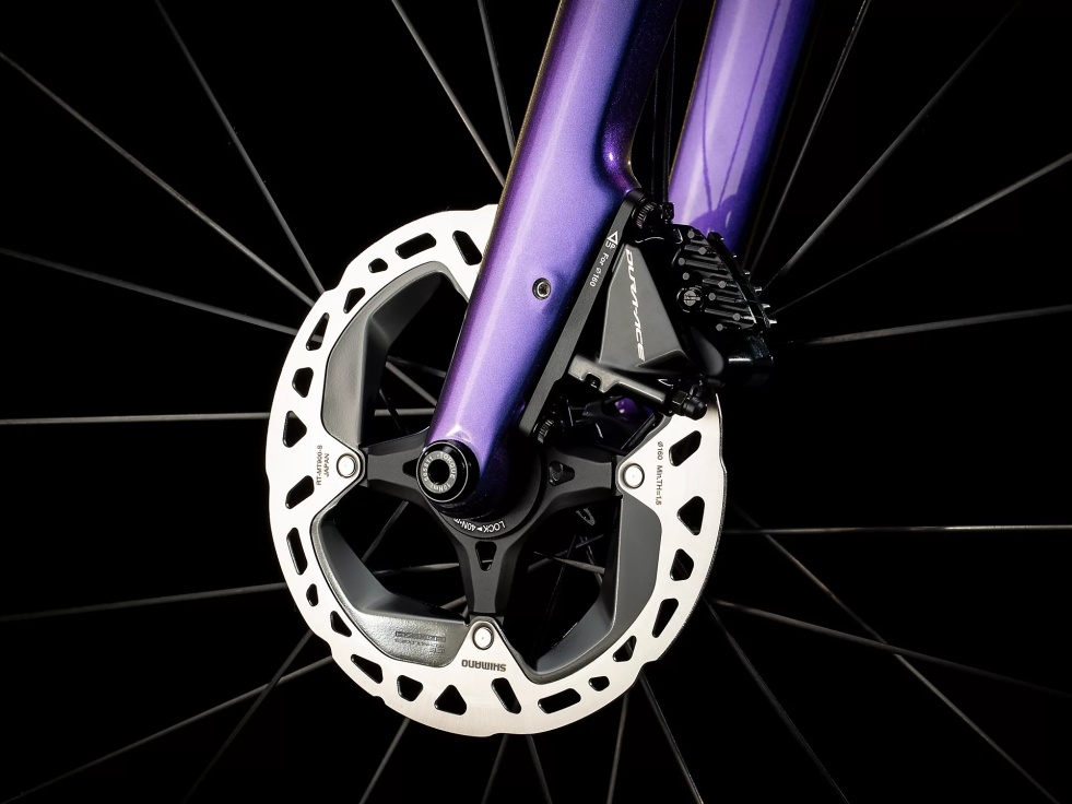 Vidlice Domane SL karbon, kónický karbonový sloupek, vnitřní vedení brzdových lanek, úchyty na blatníky, kotouč s úchytem Flat Mount, pevná osa 12 × 100 mm.