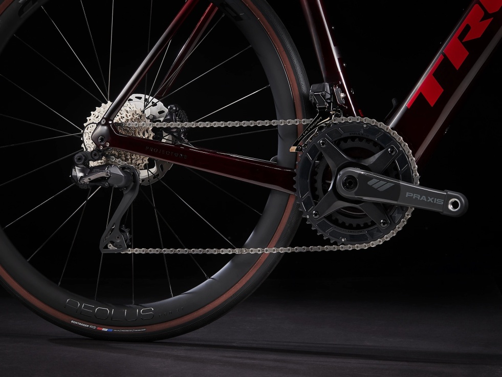 Náš nejlepší a nejlehčí rám z karbonu OCLV řady 800 a vidlici se zadním prvkem IsoSpeed. Motor TQ s harmonickou válečkovou převodovkou (360 Wh, 50 Nm), integrovanou baterii, chytrý integrovaný LED displej, nenápadný ovladač na páčce pro přepínání režimů podpory, kola Aeolus Pro 37 z karbonu OCLV, bezdrátovou elektronickou sadu Shimano Ultegra Di2 2x12, karbonové kliky, řídítka Bontrager Pro IsoCore tlumící vibrace a představec RCS Pro s bowdeny vedenými uvnitř pro elegantní vzhled.
