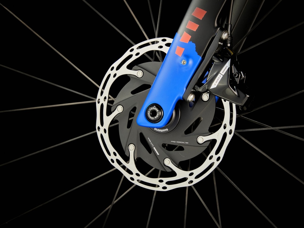 Vidlice Domane+ karbon, kónický karbonový sloupek, vnitřní vedení brzdových lanek, úchyty na blatníky, kotouč s úchytem Flat Mount, pevná osa 12 × 100 mm.