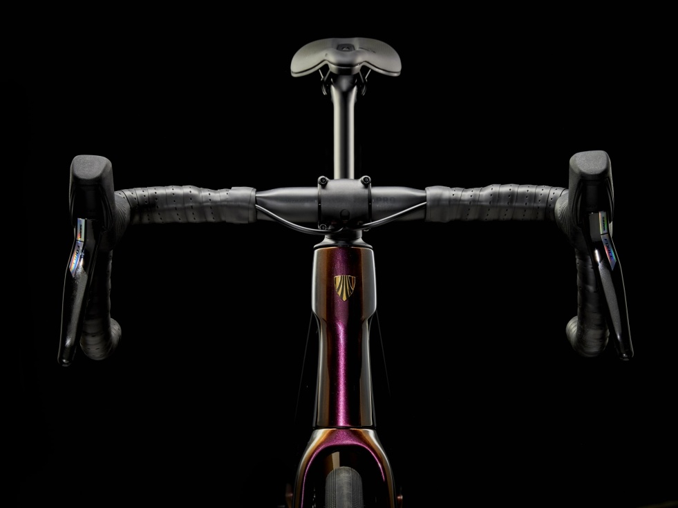 Mimořádně lehký propracovaný rám a vidlice z karbonu OCLV řady 800, zadní prvek IsoSpeed, integrovaný vnitřní úložný prostor a úchyty na horní rámové trubce. Kolo je vybaveno bezdrátovým elektronickým pohonem 2x12 SRAM Force AXS D2, klikami s wattmetrem pro sledování výkonu, účinnými kotoučovými brzdami s úchytem Flat Mount, karbonovými koly Aeolus Pro 37 a řídítky Bontrager Pro IsoCore tlumícími vibrace o 20 % víc než standardní karbonová řídítka.