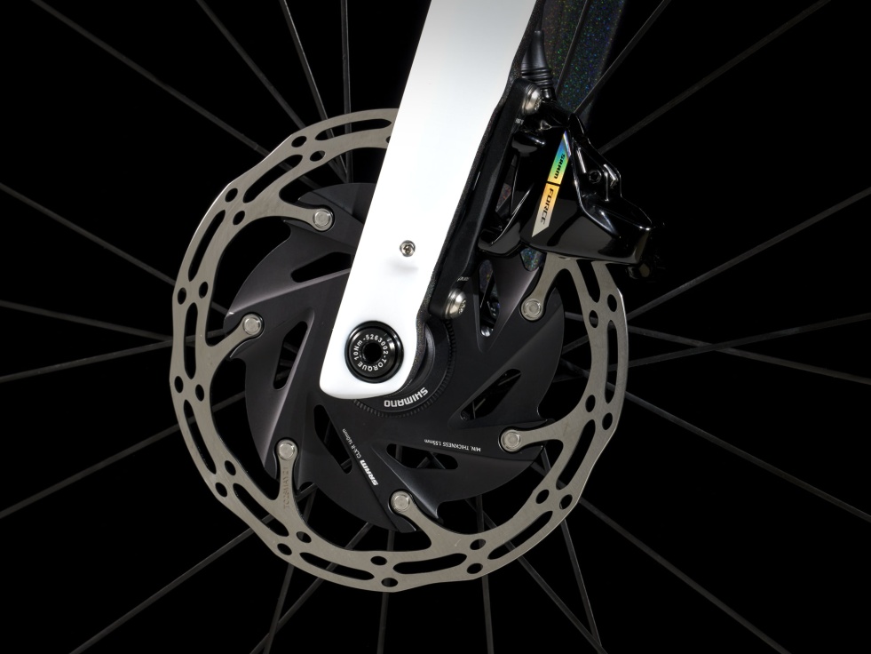 Vidlice Domane SLR karbon, kónický karbonový sloupek, vnitřní vedení brzdových lanek, úchyty na blatníky, kotouč s úchytem Flat Mount, karbonové patky, pevná osa 12 × 100 mm.