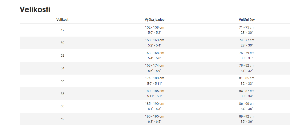 Představec : Velikost: 50 Trek RCS Pro, –7 stupňů, délka 80 mm. / Velikost: 52, 54 Trek RCS Pro, –7 stupňů, délka 90 mm. / Velikost: 56, 58 Trek RCS Pro, –7 stupňů, délka 100 mm. / Velikost: 60, 62 Trek RCS Pro, –7 stupňů, délka 110 mm.