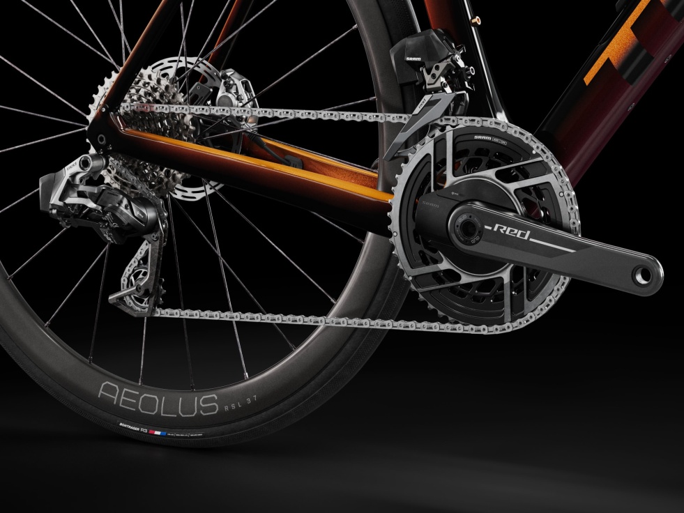 Mimořádně lehký propracovaný rám a vidlice z karbonu OCLV řady 800, zadní prvek IsoSpeed, integrovaný vnitřní úložný prostor a úchyty na horní rámové trubce. Kolo je vybaveno bezdrátovým elektronickým pohonem SRAM RED AXS, klikami s wattmetrem pro sledování výkonu, účinnými kotoučovými brzdami s úchytem Flat Mount, karbonovými koly Aeolus Pro 37 a řídítky Bontrager Pro IsoCore tlumícími vibrace o 20 % víc než standardní karbonová řídítka.