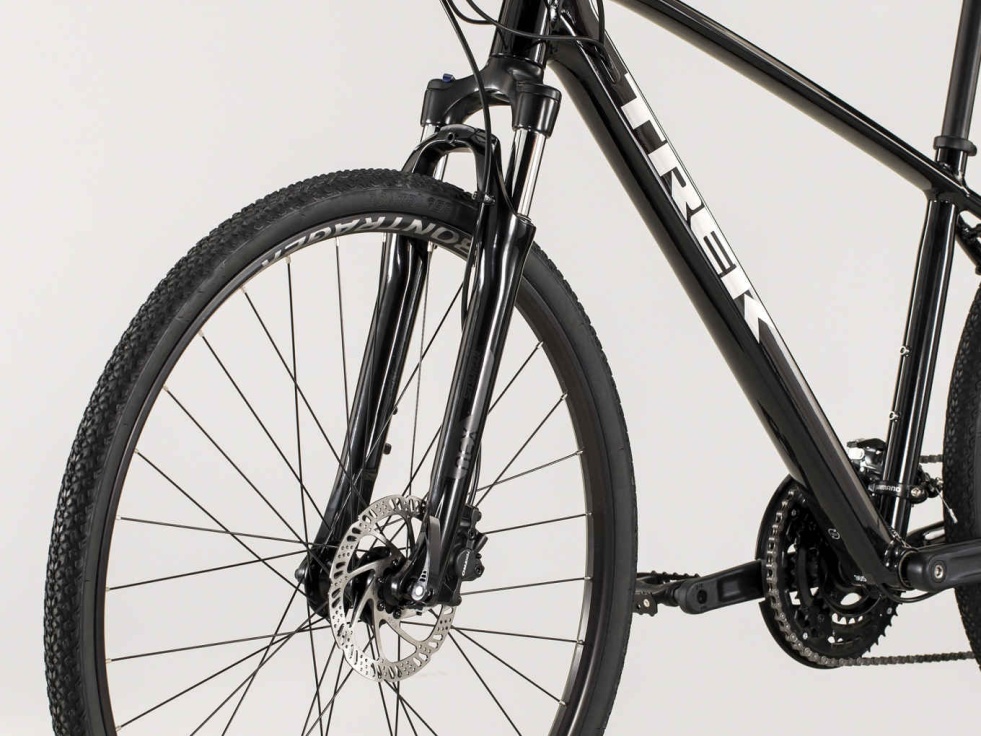 Lehký hliníkový rám Alpha Gold, odpružená vidlice SR Suntour NEX se zamykáním, 24rychlostní kazeta Shimano a široký rozsah převodů, aby nikdy nebylo třeba šlapat příliš namáhavě či příliš snadno, rychlé pláště Bontrager LT2 do každého terénu nabízející extra trakci, hydraulické diskové brzdy pro brzdný účinek za každého počasí, ergonomické gripy a úchyty na nosič, blatníky a další.