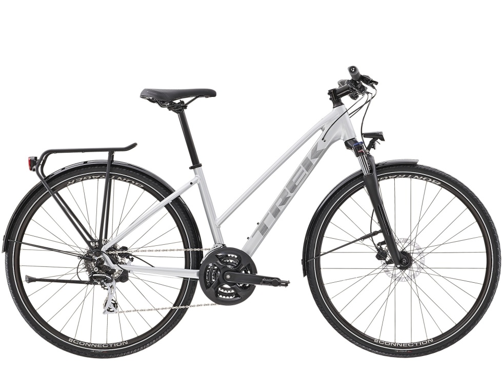 Lehký hliníkový rám Alpha Gold s geometrií Stagger pro snazší nasedání a sesedání, odpružená vidlice SR Suntour NEX se zamykáním, 24rychlostní pohon Shimano a široký rozsah převodů, takže nikdy není třeba šlapat příliš namáhavě či příliš snadno, široké a rychlé pláště Bontrager do každého terénu pro vyšší trakci, hydraulické kotoučové brzdy pro brzdný účinek za každého počasí, ergonomické gripy, blatníky, zadní nosič, světla a stojánek.