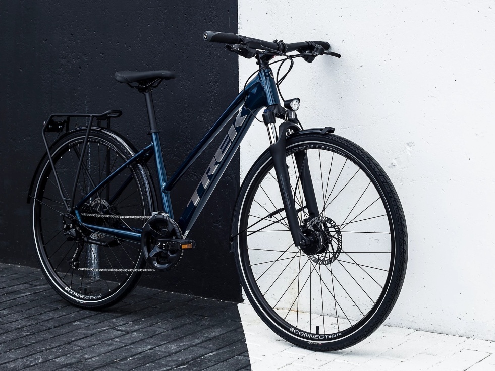 Lehký hliníkový rám se sníženou horní trubkou pro snazší nasedání a sesedání, uzamykatelná odpružená vidlice, pohon Shimano 2x9 se širokým rozsahem převodů, přední nábojové dynamo k napájení světel, široké a rychlé pláště Bontrager s extra trakcí do každého terénu, hydraulické kotoučové brzdy, ergonomické gripy, blatníky, zadní nosič kompatibilní s MIK, světla a stojánek.
