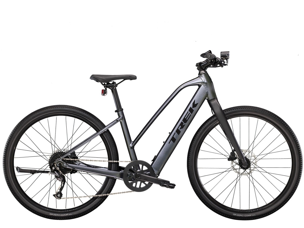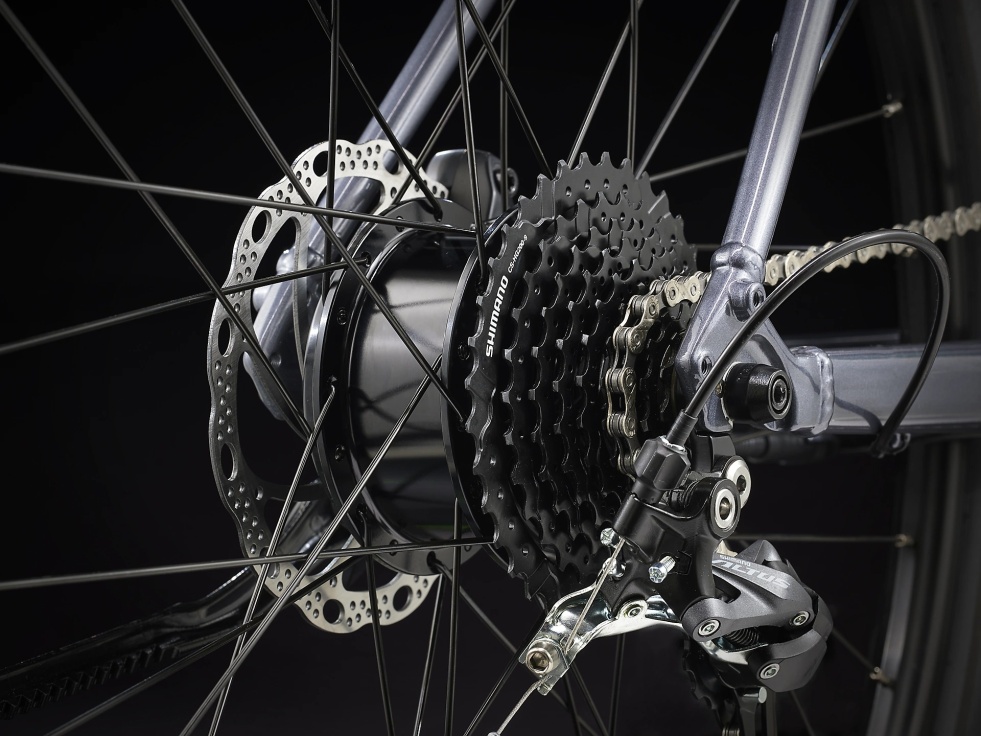 Lehký hliníkový rám se sníženou rámovou trubkou, díky níž je nasednutí i sesednutí ještě snazší, patentovaný systém podpory šlapání Trek s motorem v náboji (250 W, 40 Nm), který poskytuje podporu až do rychlosti 25 km/h, a 250Wh baterie pro dojezd až 55 kilometrů na jedno nabití. Tuhá kola 650b, široké pláště 50c pro výkon a pohodlí na různých površích, spolehlivý 9rychlostní pohon Shimano, hydraulické kotoučové brzdy, integrovaná světla napájená z baterie a stojánek.