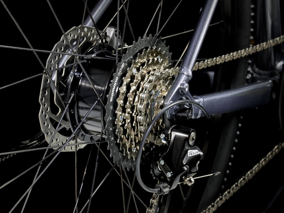 Lehký hliníkový rám se sníženou rámovou trubkou, díky které je nasednutí i sesednutí ještě snazší, patentovaný systém podpory šlapání Trek od značky Hyena s motorem v náboji (250 W, 40 Nm), který poskytuje podporu až do rychlosti 25 km/h, a 250Wh baterie pro dojezd až 55 kilometrů na jedno nabití. Tuhá kola 650b, široké pláště 50c pro výkon a pohodlí na různých površích, spolehlivý 8rychlostní pohon Shimano, hydraulické kotoučové brzdy, integrovaná světla napájená z baterie a stojánek.
