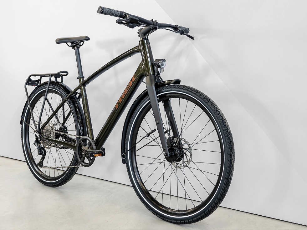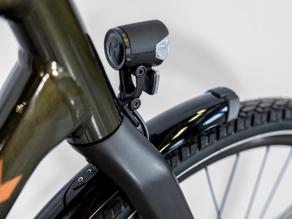 Lehký hliníkový rám s elegantním vnitřním vedením lanek, lehká karbonová vidlice, široká kola Bontrager Kovee 650b umožňující použití bezdušových plášťů a široké pláště 50c pro výkon a pohodlí v různém terénu a jednoduchý převod 1x10 Shimano Deore bez přesmykače pro snadnější ovládání. A nemějte obavu. Kazeta 11-46 se širokým rozsahem nadále poskytuje potřebné převody na zdolání kopců a pokoření rovinek. Nábojové dynamo k napájení předních a zadních světel, výkonné kotoučové brzdy, ergonomické gripy, blatníky, stojánek a zadní nosič kompatibilní se systémem MIK.