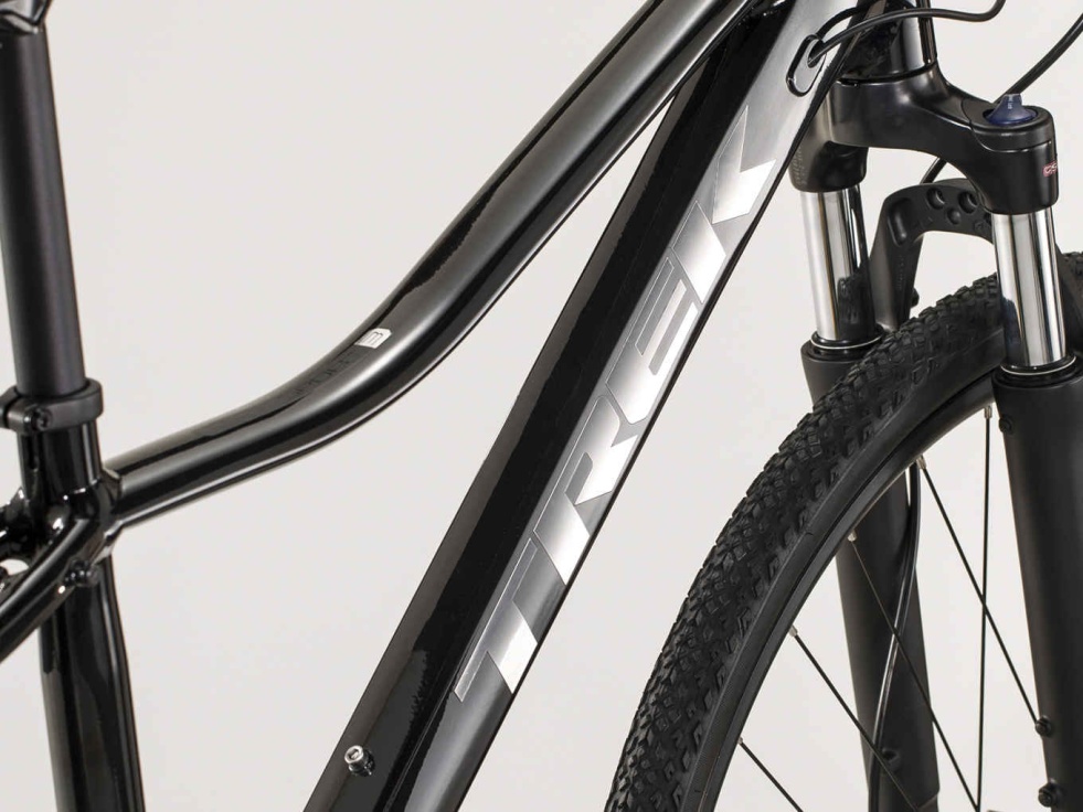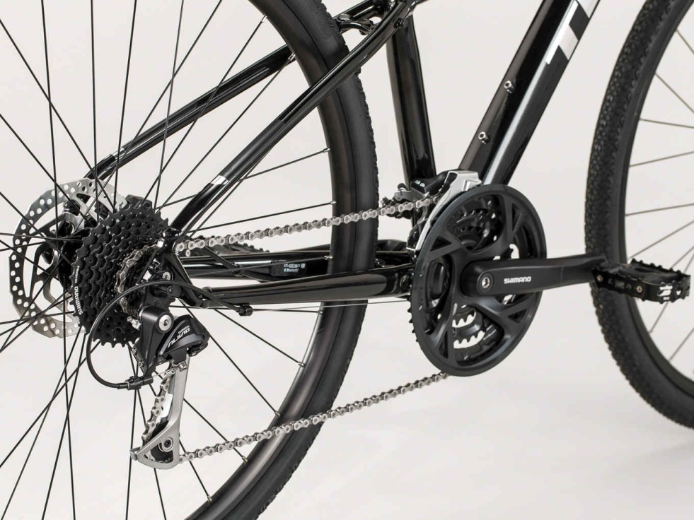Lehký hliníkový rám Alpha Gold se svažující se horní trubkou pro snadné nasedání a sesedání, vidlice SR Suntour NEX se zamykáním, 27rychlostní kazeta Shimano a široký rozsah převodů, hydraulické diskové brzdy Shimano pro brzdný účinek za každého počasí, ráfky umožňující použití bezdušových plášťů, pláště Bontrager LT2 Comp Hard-Case Lite odolné proti propíchnutí, dámské sedlo Bontrager H1, úchyty na nosič a blatníky, kompatibilita s DuoTrap S a představec Blendr pro snadné připevnění příslušenství.