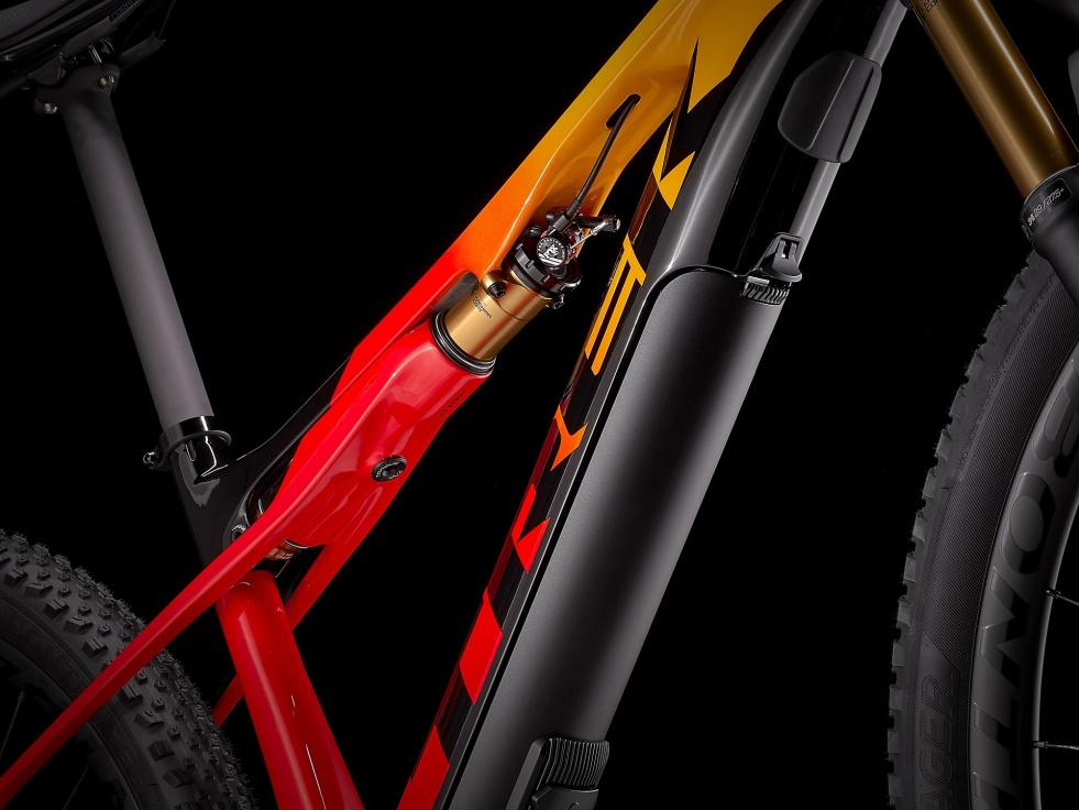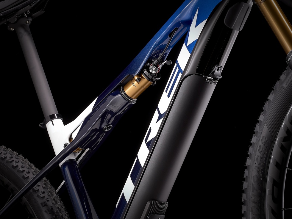 Lehký celokarbonový OCLV rám pro horská kola s 60mm zdvihem, 120mm vidlicí FOX Factory 34 Step-Cast, dvojí vzdálené zamykání a lehký tlumič IsoStrut FOX Factory značky Trek. Motor Fazua Evation a 250Wh baterie zajišťují podporu šlapání do 25 km/h a po jejich vypnutí není cítit žádný odpor. Ovladač Fazua Remote FX je umístěn na řídítkách. Pohon Shimano XTR, karbonová sedlovka Bontrager XXX a karbonová kola Kovee XXX 30.