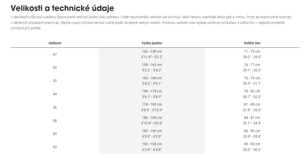 | Hmotnostní limit | Kolo má maximální celkový hmotnostní limit 125 kg (kombinovaná hmotnost kola, jezdce a nákladu). |