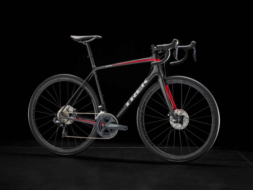 Plná elektronická sada komponent Shimano Ultegra Di2 s 11 rychlostmi, karbonová kola Bontrager Aeolus Pro 3 Disc, výkonné hydraulické kotoučové brzdy s úchytem Flat Mount a velmi lehký rám z karbonu OCLV řady 500.