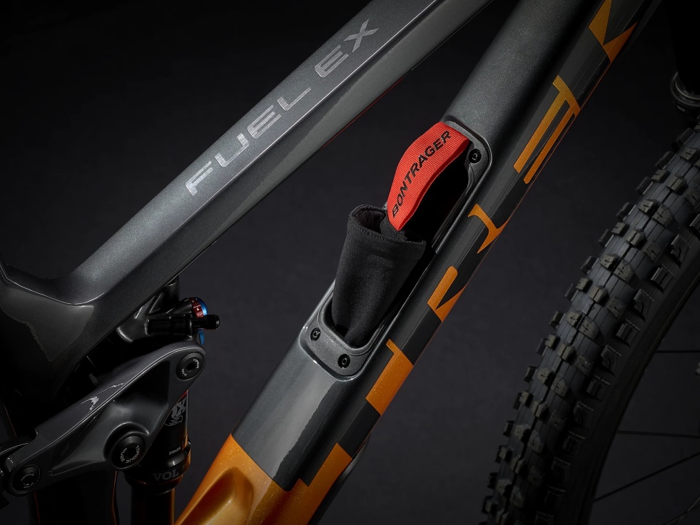 Lehký a tuhý celokarbonový rám s vnitřním úložným prostorem, vidlice FOX Performance 36 se širšími sloupky pro větší tuhost v drsném terénu a tlumič RE:aktiv s Thru Shaft. Pohon SRAM GX Eagle s 52zubým převodem na stoupání, díky němuž ušetříte energii, a karbonová kola Bontrager s 108zubým nábojem Rapid Drive s okamžitou aktivací.